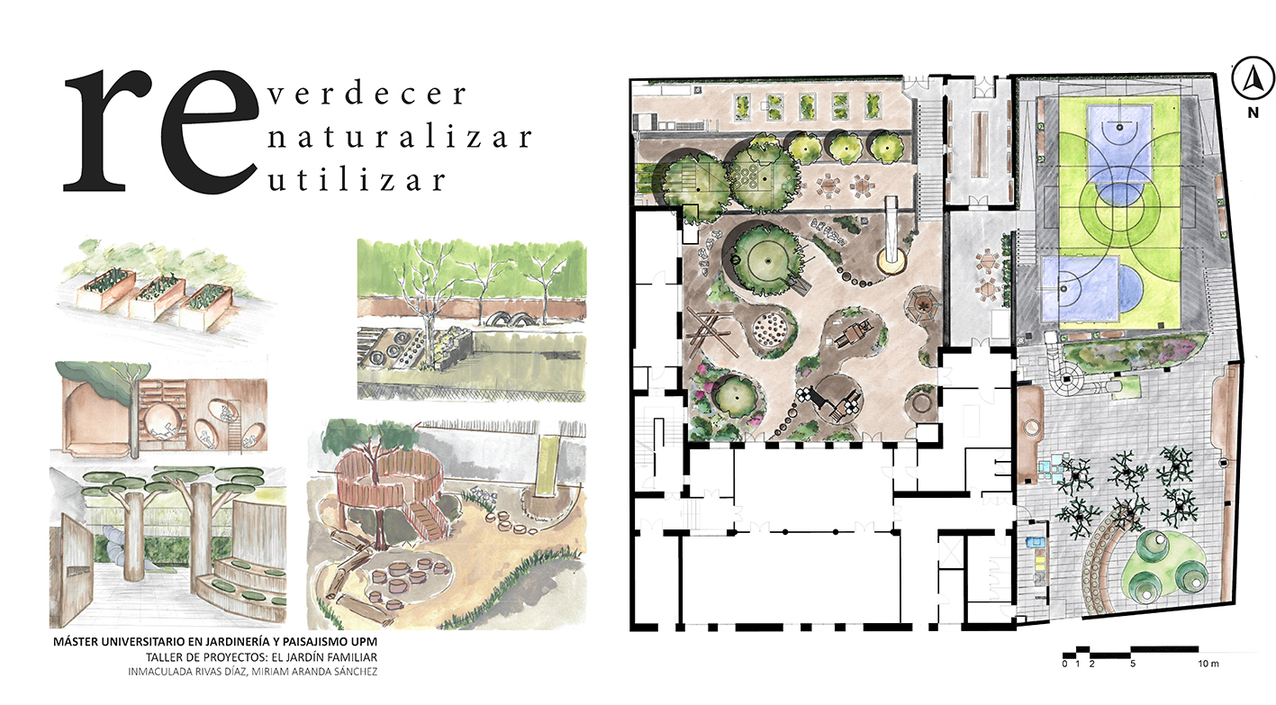 El diseño del ajardinamiento se ha elaborado, en sus distintas fases, por los estudiantes de las asignaturas “Paisajismo I” y “Talleres de proyectos: el jardín familiar” del Máster Universitario en Jardinería y Paisajismo, como actividad incluida en la programación de estas asignaturas para el actual curso académico 2023-2024. Para elaborar el citado diseño, se ha trabajado en colaboración con los alumnos y las alumnas de Primaria, sus profesores, tutores y el equipo directivo del Centro, llevándose a cabo actividades tanto en el aula como en los patios.