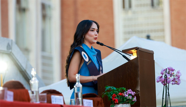 Otra de las grandes protagonistas de la jornada fue la egresada Marianela Estévez Guzmán, alumna del grado en Ingeniería Agroambiental, que ha obtenido el mejor expediente de la Escuela y que, por tanto, ha sido la encargada de pronunciar el discurso en representación de todos sus compañeros/as egresados. A todos ellos les unió “la ambición por comprender el mundo agrario y alimentario” y, cuatro años después, salen de la ETSIAAB cargados de “conocimiento y aprendizaje” y con un gran “orgullo de haber estudiado en esta Escuela, que siempre será nuestro hogar”, confesó la egresada. Satisfecha por la dedicación y el esfuerzo que hay detrás de cada título, Marianela se mostró segura de que todos sus compañeros serán “unos grandes profesionales” y que desempeñarán una “importante” labor en el mundo actual.